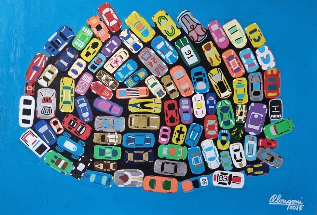 Questo quadro nasce da una installazione” realizzata dal mio nipotino Federico (5 anni), che adora mettere in ordine i suoi modellini di macchine. Mi è parso che questa disposizione a spirale avesse una sua originalità e ho voluto riprodurla. Inizialmente lo sfondo era grigio come nella foto, ma poi l’ho modificato in azzurro. Ecco il risultato.