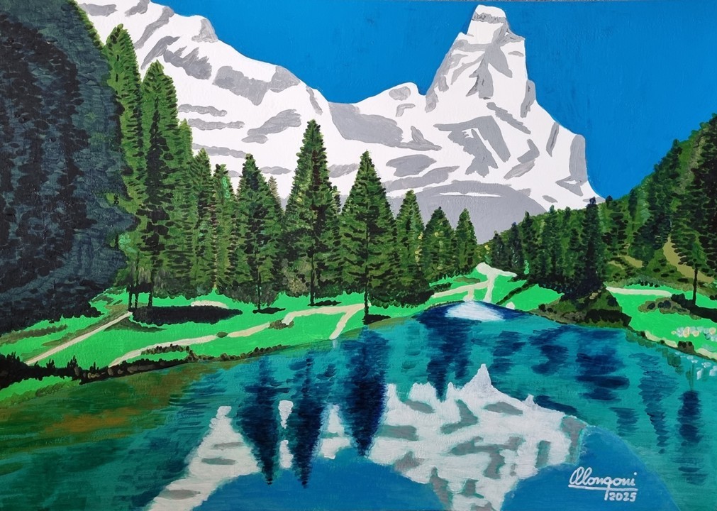Questo lavoro mi è stato commissionato da mio figlio Niccolò e da mia nuora Sofia per inaugurare una parete di casa ispirata alla montagna. Si tratta di un panorama classico della Val d’Aosta con, sullo sfondo, l’inconfondibile profilo del Cervino.