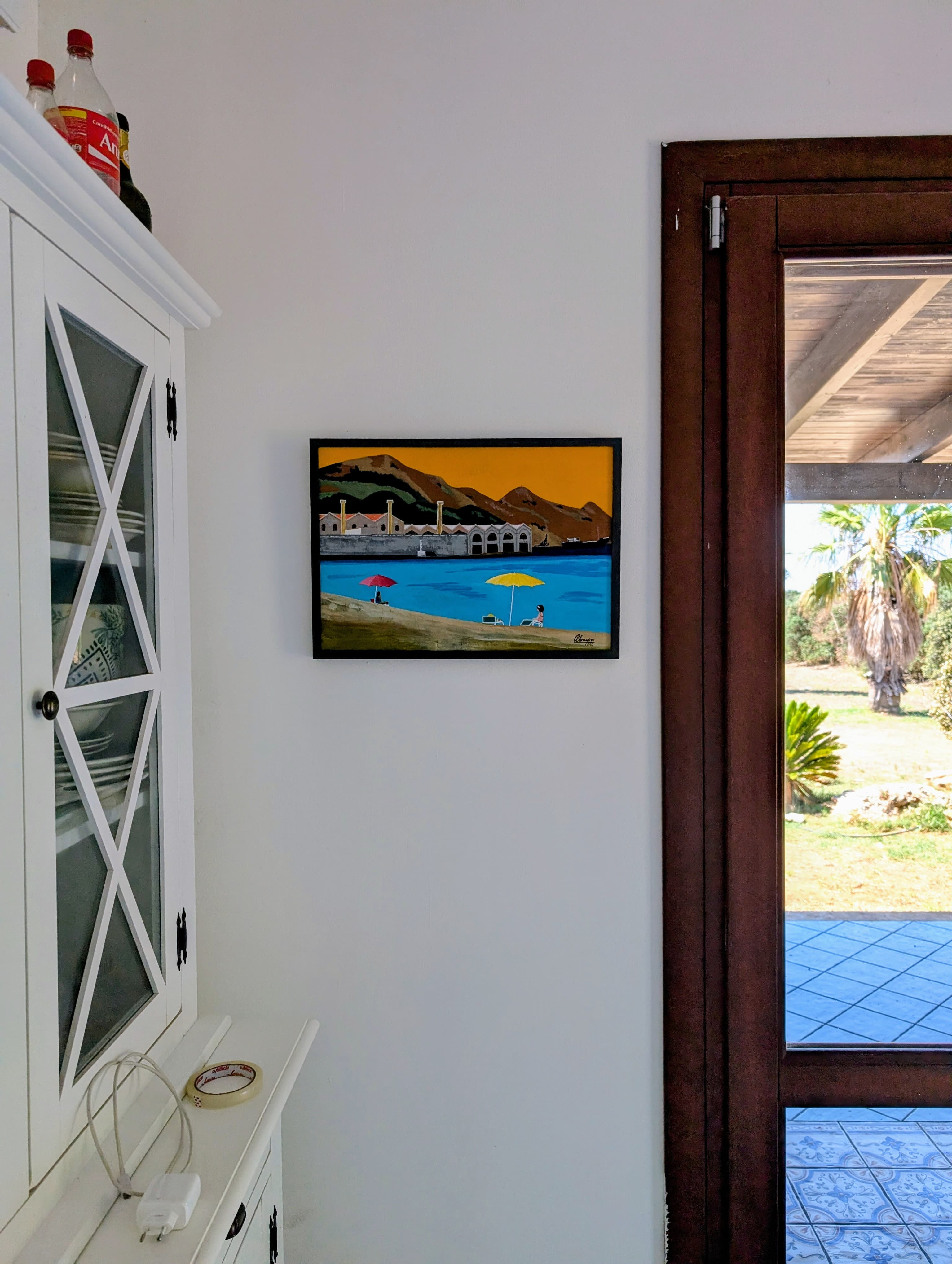 Il quadro nasce in bozza nell’estate del 2022 a Favignana e viene completato un anno dopo, durante la tradizionale vacanza a casa degli amici Alfredo e Donatella. E’ la terza opera che viene esposta sulle pareti di Villa Tara e fa parte della collezione Tesauro-Sajeva.
